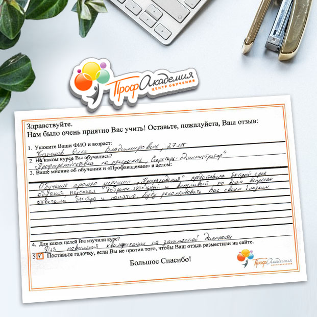 Обучение кадровому делопроизводству прошло успешно, "Профакадемия" предоставила быстрый срок обучения, персонал доброжелательный и вежливый, по всем вопросам отвечали быстро и понятно. Буду рекомендовать Вас своим близким.