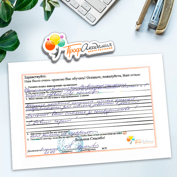 Хочется выразить огромную благодарность ООО "Профессиональная академия" за предоставления образовательной услуги. Особое спасибо специалисту по работе с клиентами Аликбаеву Николаю Ураловичу. Приятно было работать с хорошо знающим свое дело специалистом.